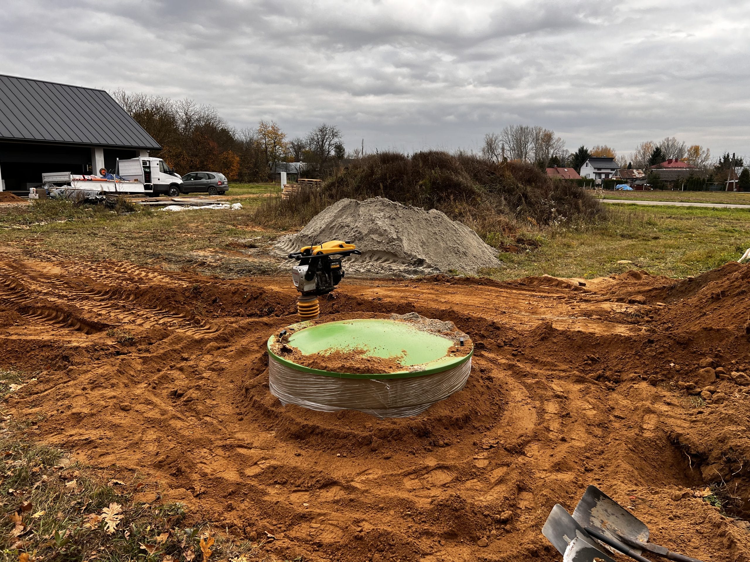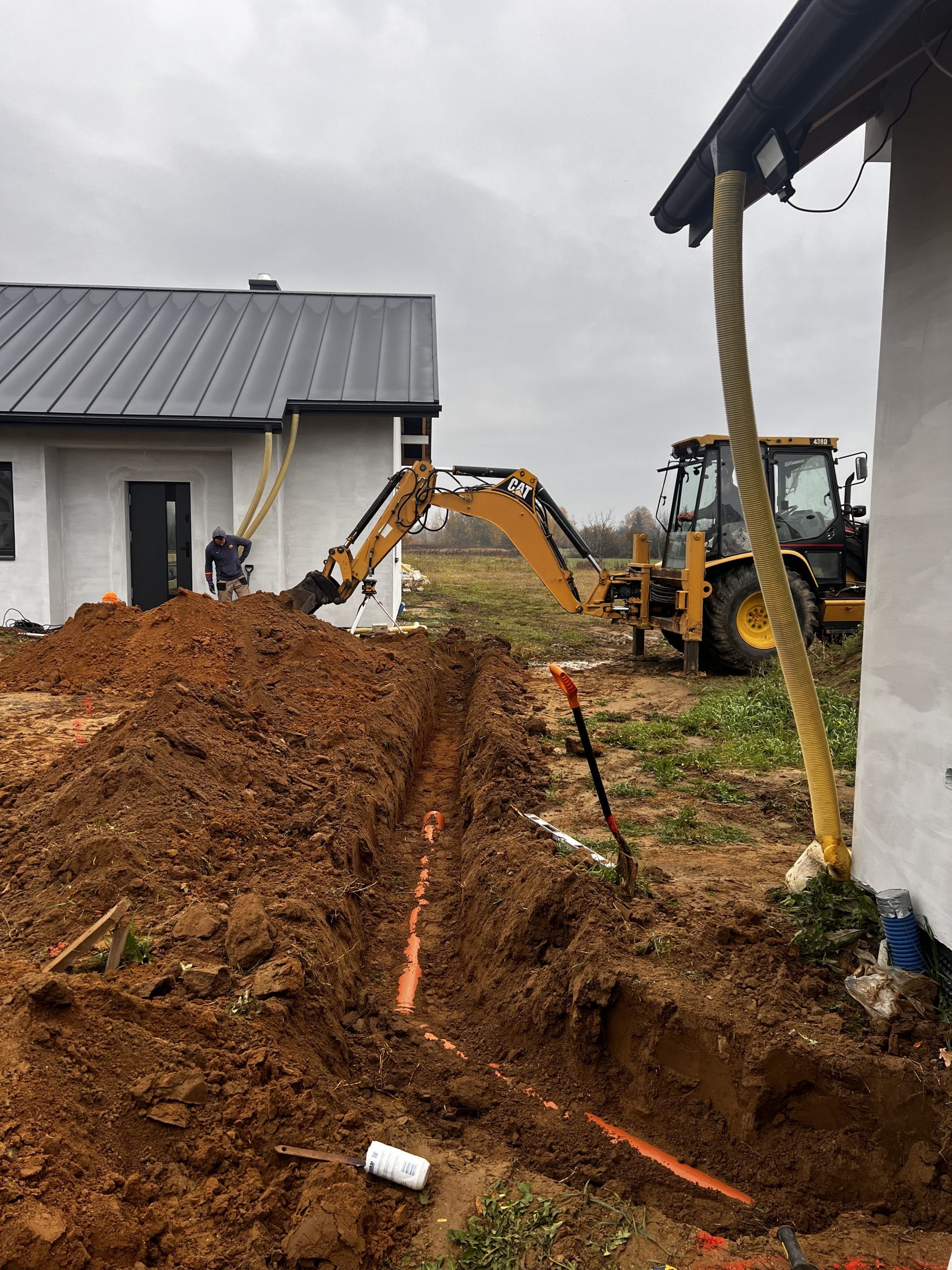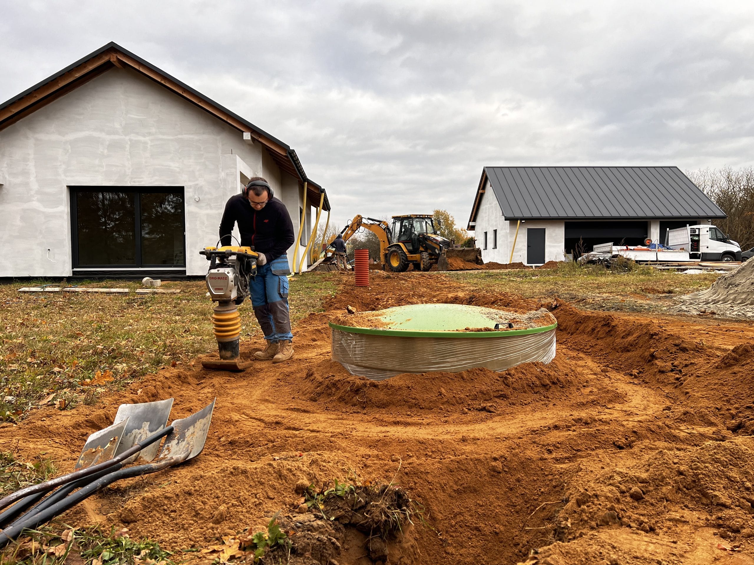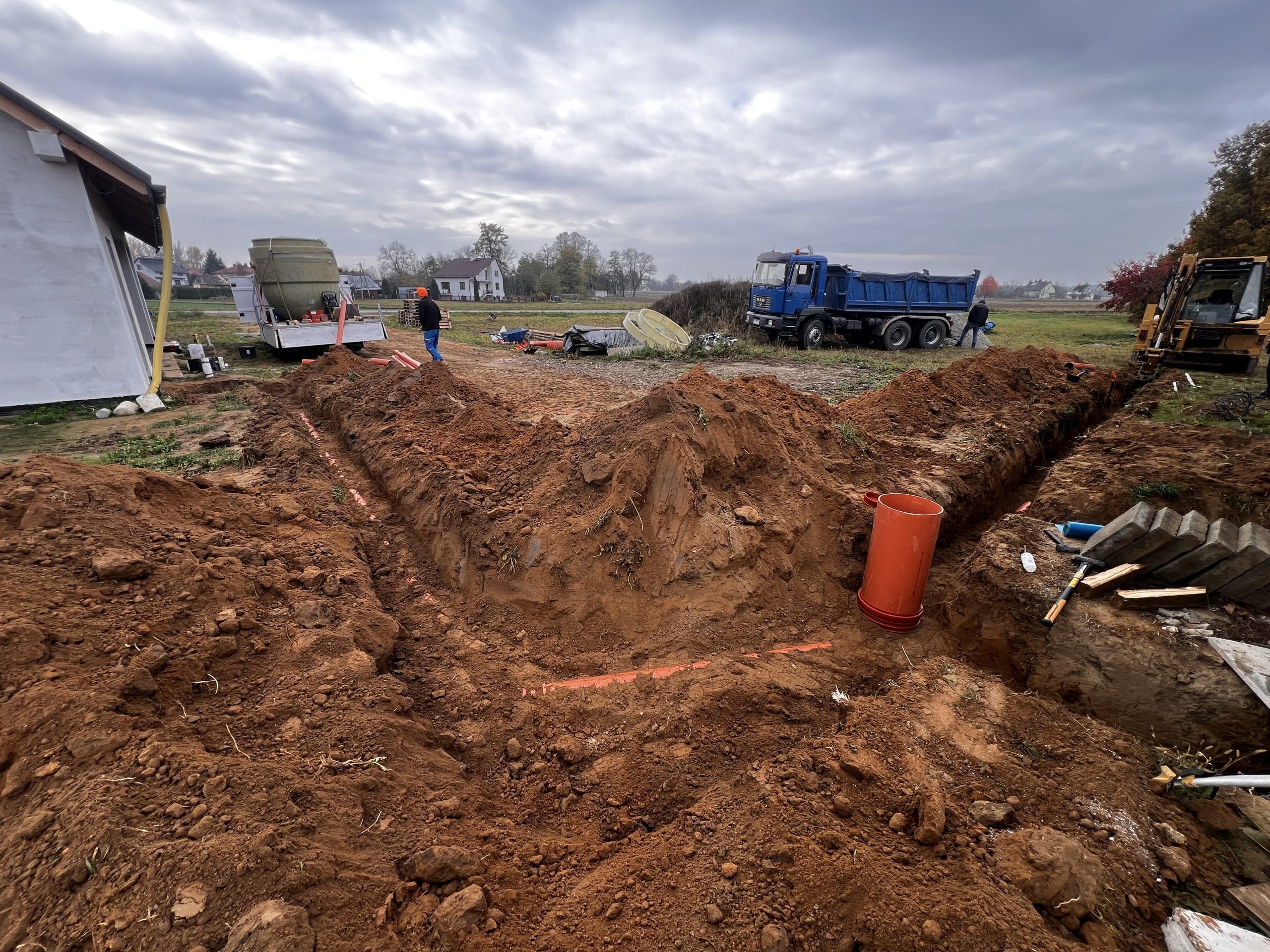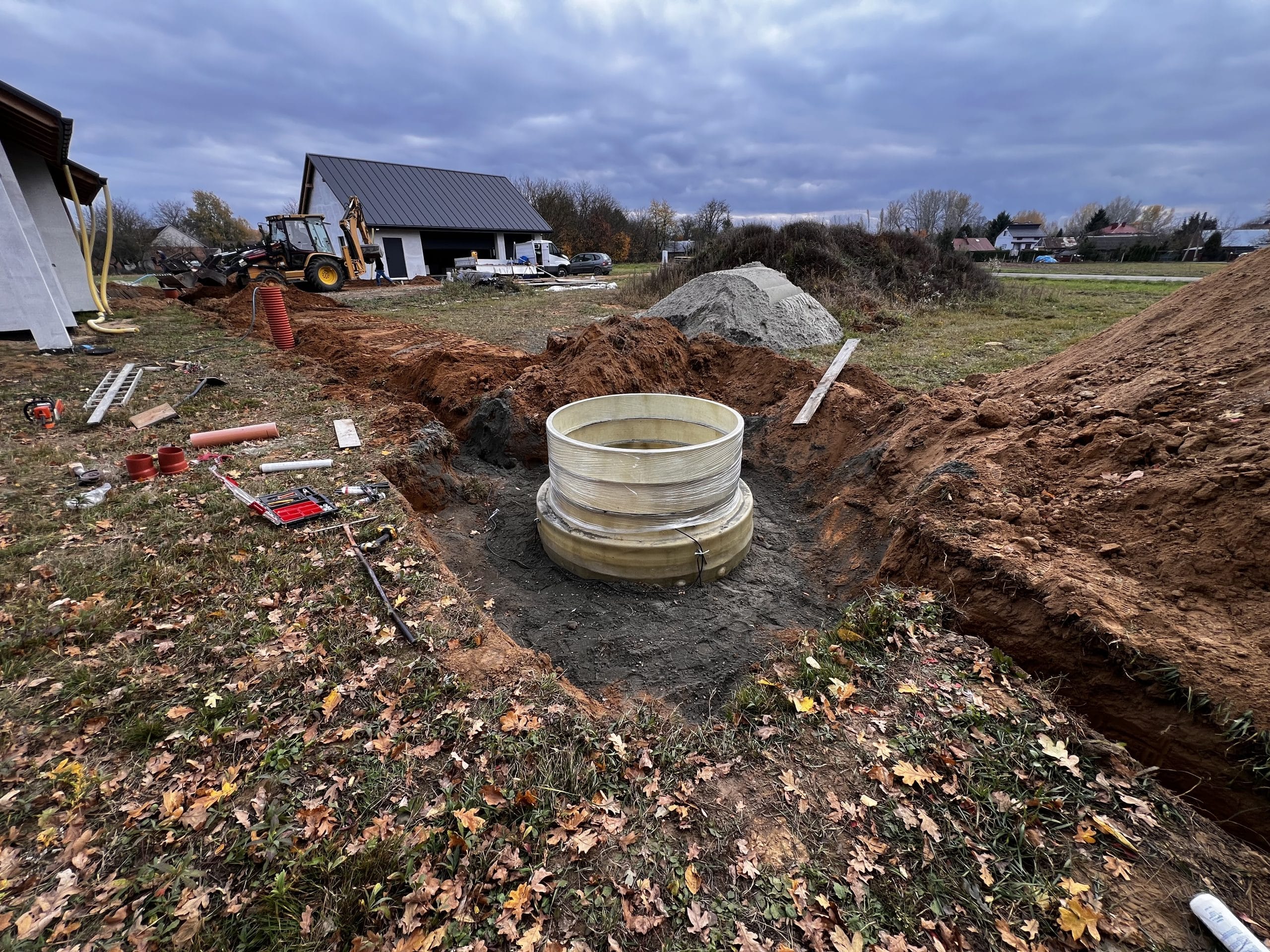 Budowa przydomowej oczyszczalni ścieków RotoSET 6 o przepustowości 1,2m3/d z odprowadzeniem oczyszczonego ścieku do cieku wodnego. Woda oczyszczona została przebadana na potrzeby właściciela cieku wodnego – Wody Polskie, oraz przeszła na każdym etapie wynik pozytywny. Dodatkowo wykonaliśmy całą instalacje kanalizacji zewnętrznej z podpięciem garażu oraz budynku mieszkalnego.